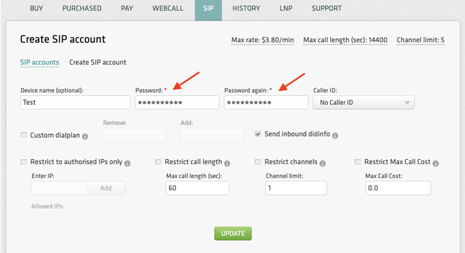 Set the Device Name (optional) and put in a Strong Password. And click Update to create the new SIP account.