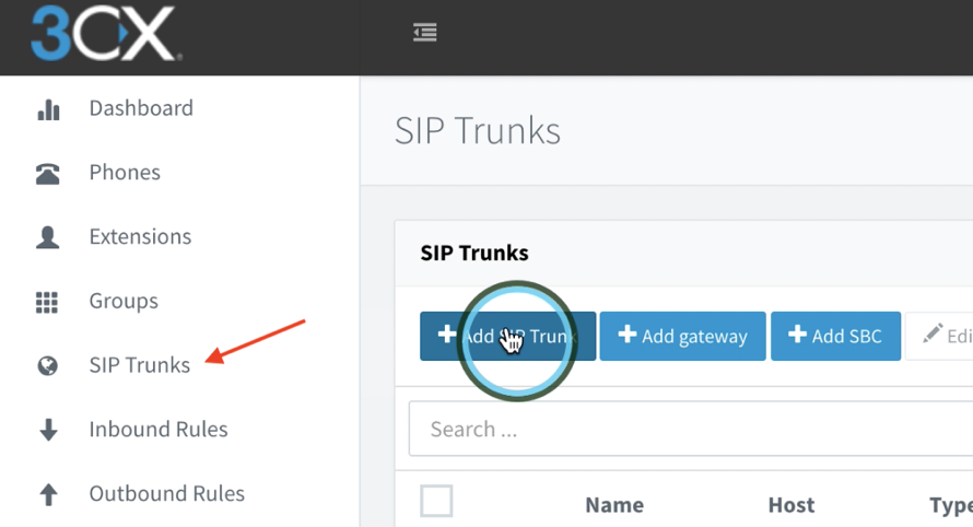 The next step would be to set up a SIP Trunk. Start by going to the left-hand side column and clicking on “SIP Trunks”. This will take you to the SIP Trunks section, where you can click on the blue button labeled “Add SIP Trunk”