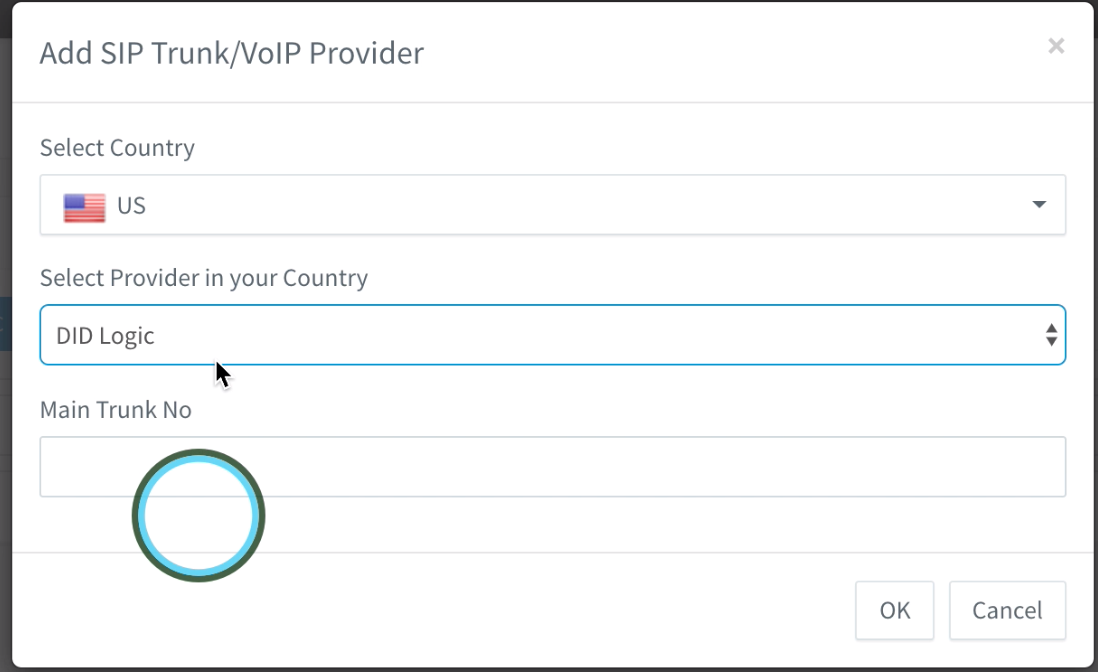 This will bring up a Prompt, where you can select Country, and DID Logic as the Provider. (Main Trunk No is the field where you can put in a default Caller ID for calls made through this SIP Trunk.) Then click “OK”