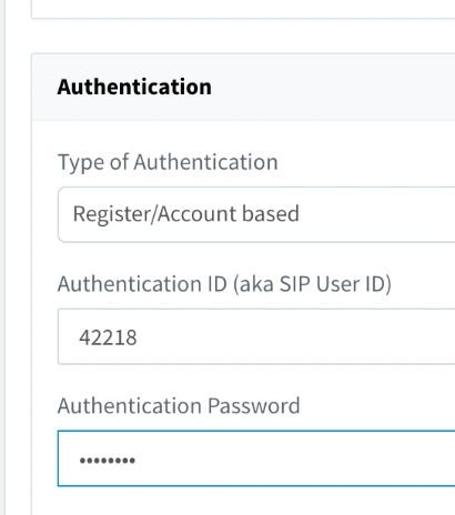 Next is to scroll down to the section labeled “Authentication”. Here you would fill out the field with the credentials you created at the beginning of this guide on the SIP Accounts section of the DID Logic Portal.