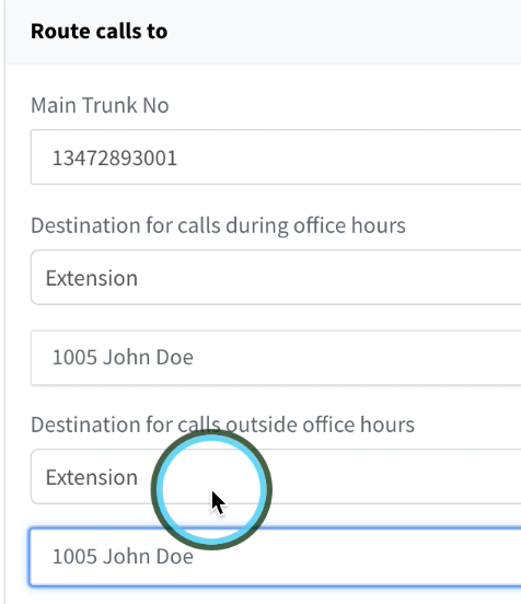 In the next section, “Route calls to”, you can configure how the default inbound calls are routed. For this guide, we are routing them to the test extension that we created earlier.