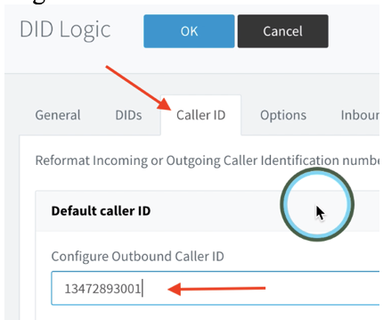 Next, we can set the “Default Caller ID” by clicking on the tab labeled “Caller ID” and fill out the first field labeled “Configure Outbound Caller ID” with the DID you purchased from DID Logic