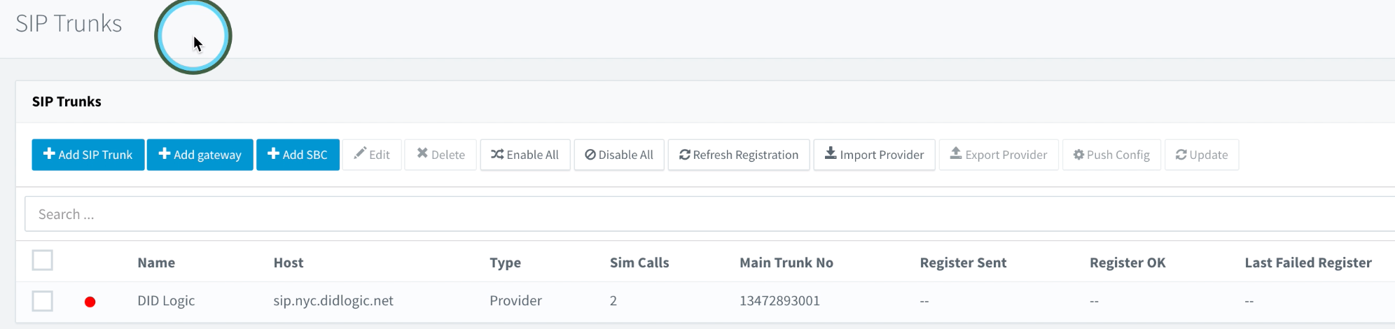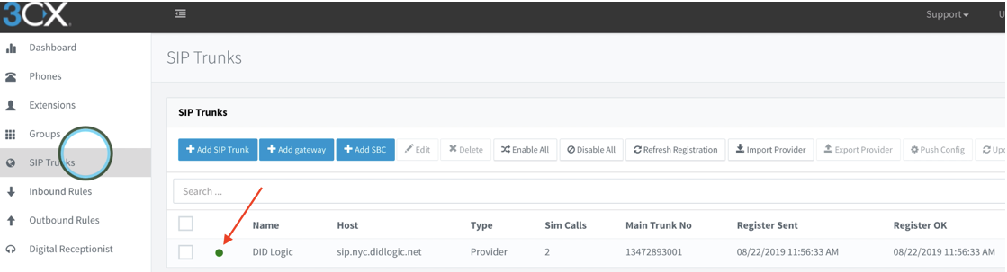 At this time, we should return to the SIP Trunks section and confirm we have an active registration with the Regional DID Logic Proxy. If you see a green dot indicator next to the DID Logic SIP Trunk, we know that it was successfully able to register.
