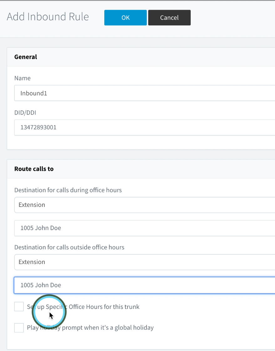 Once you are on the Add Inbound Rule page, you can enter in the DID you have purchased from the DID Logic Portal and set the destination for, and decide how the call should be processed within 3CX. In our case we will be routing all calls to our test DID over to the Test Extension (Extension 1005). (See screenshot below)