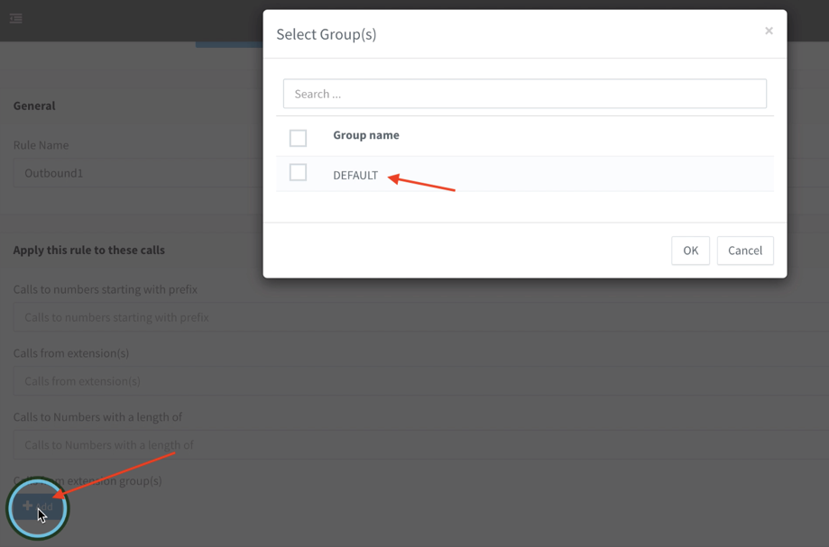 Within the “Add Outbound Rule” section, after we have named this rule “Outbound1”, we applied the rule to the Default extension group, but clicking on the “Add” button in the “Apply this rule to these calls” section, and checking off the “DEFAULT” group name. This should make the rule apply to all the extensions we have created so far, as they are automatically assigned to the DEFAULT group.