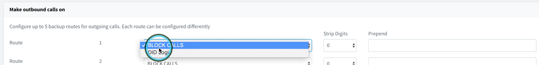 Finally, we want to send outbound calls out via the DID Logic SIP Trunk. You can select the SIP Trunk by clicking on the dropdown list in the “Make outbound calls on” section.