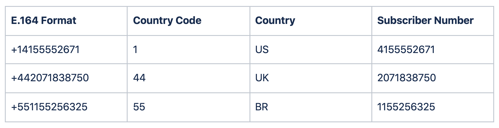 E.164 is the international telephone numbering plan that ensures each device on the PSTN has a globally unique number. This is what allows phone calls and text messages can be correctly routed to individual phones in different countries. E.164 numbers are formatted [+] [country code] [subscriber number including area code] and can have a maximum of fifteen digits.