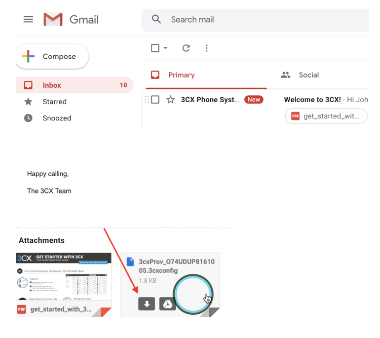 Log into your email and open the Welcome Email from your 3CX PBX Server. From the welcome email, you will be able to download the configuration file to set up the 3CX client, by opening the configuration file from the 3CX Softphone.