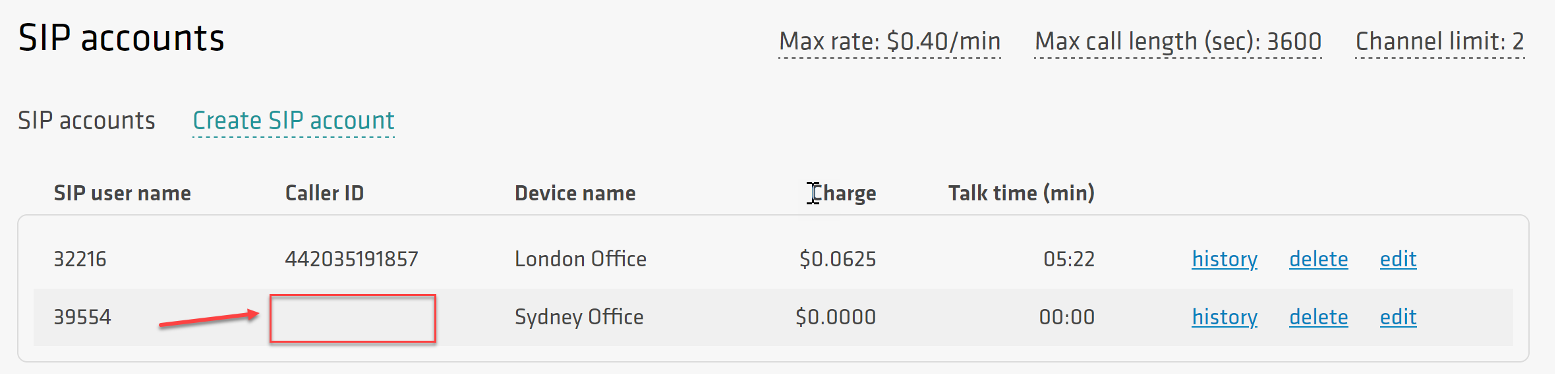 Log in to the DID Logic Portal, go to the SIP section, and click Edit on the SIP Account. Remove Caller ID and click Update: