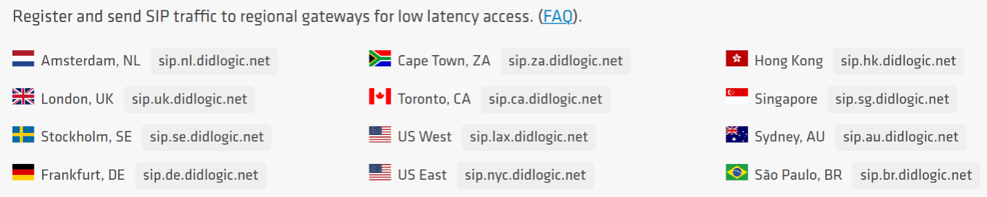 To receive inbound calls, you must register your SIP Account with one of the regional DID Logic gateways: