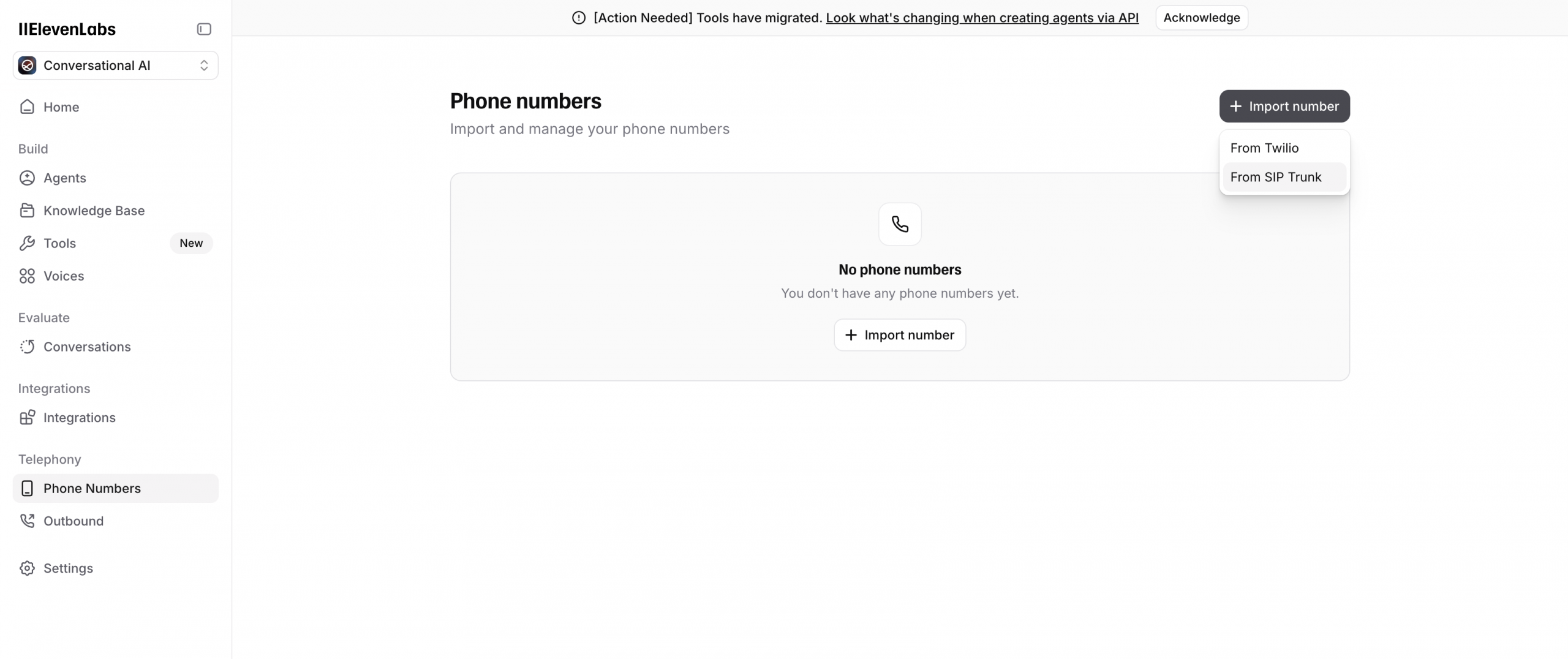 - Go to: https://elevenlabs.io/app/conversational-ai/phone-numbers