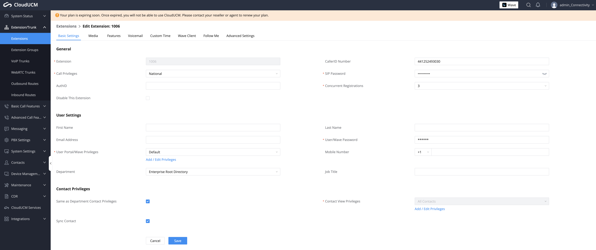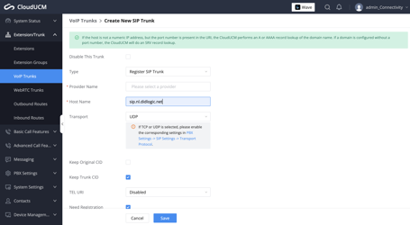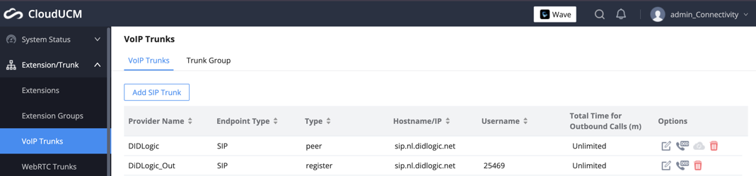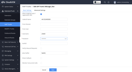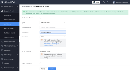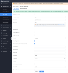 - Log in to the CloudUCM Admin Portal and select Extension/Trunk> VOIP Trunks > Add SIP Trunk.