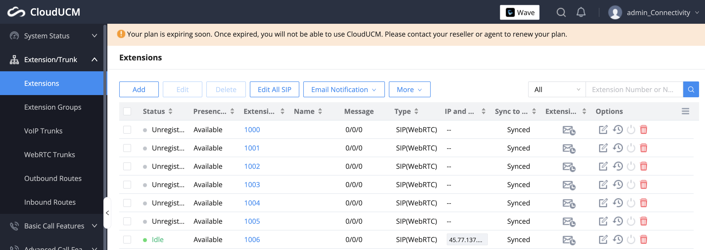 If all details are entered correctly, the extension will be successfully logged in and ready for use. Registration can be confirmed by navigating back to the CloudUCM and opening the Extensions section. A green “Idle” status will indicate successful registration.