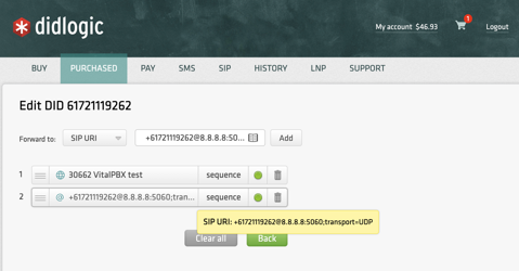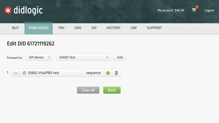 To route calls to your VitalPBX instance, log in to your DIDlogic account, select PURCHASED in the top menu, and click on the DID’s Destination link.