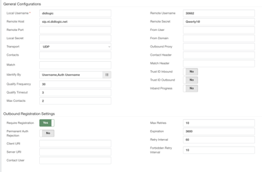 Next, in the sections “General Configurations and Outbound Registration Settings,” define the fields below.