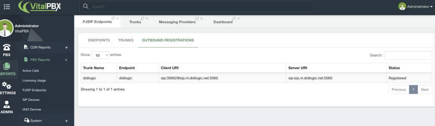Additionally, you can check the trunk registration status by selecting the “Outbound Registrations” tab in the “PJSIP Endpoints” module.