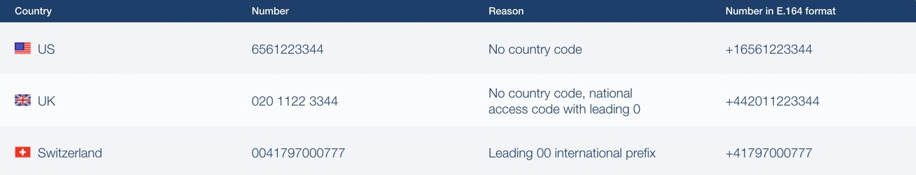 All destination phone numbers must be in the E.164 international format. E.164 numbers can have up to fifteen digits and are usually formatted as follows:[+][country code][subscriber number including area code]. An example of a US number in E.164 format is +16561223344. The DIDlogic platform rejects calls to numbers without country codes or carrying national access codes.